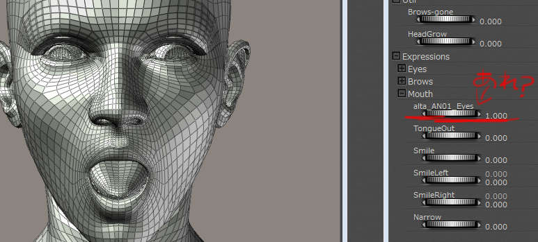 なぜか、Expressionsツリー以下のMouthの中に、alta_AN01_Eyesというモーフがあって、それが1になっててどうもこれ元々MouthOpenのようだ。