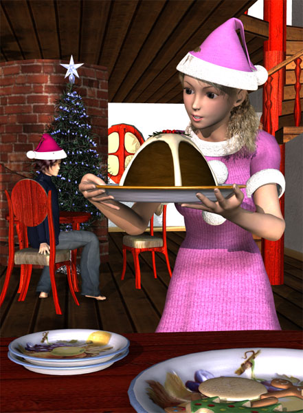 A3を置いて、服を着せて、ツリーを呼び出して(確か、コンパラで昨年、無料で配布していた。今はどうだろう?)、なんだか画面が寂しいので、レンダロでクリスマスな食べ物(Christmas Freebie 2008 - Holiday Goodies)をダウンロードして机の上に並べたり、A3に持たせたり。