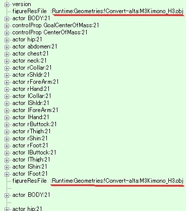 この中の下の方に、『figure』という項目があるので、それを開いてさらに中(下階層)にある『material **』(**の部分はパーツ名とかになっている)という部分を左側(Hiro3用)のfigureの下の同じような位置に入れます。