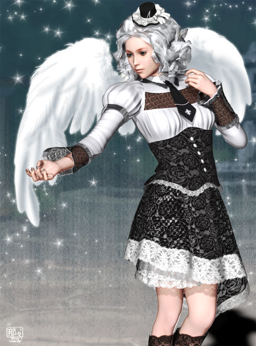 そのほかに使わせてもらっているのは、ゴスドールの方でManiHoniさんのアニー皮(レンダロの有料物)、ShareCGで見つけたけど今は見つからない髪、ふわふわ素材集に入っていた羽、コンパラで昔貰ったキラキラしたブラシ。