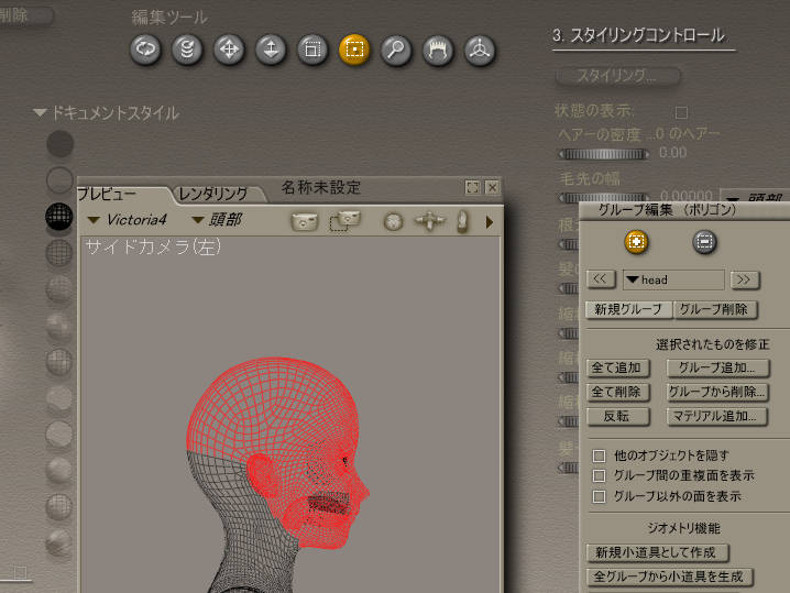 まずは頭(head)の方からSkullcapを作ることにします。(フィギュアからのスカルキャップの作り方は、Poser7のヘルプ→Poserチュートリアルマニュアル→『リアルさの追求』→『第12章「ヘアー」ルーム』→『マルチグループ化された髪の作成』の項目にあります。ちなみにその上の方には、ヘアールームの基本的な操作方法なんかが載ってます)