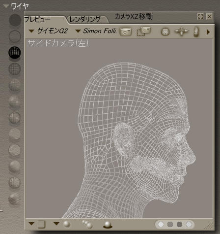 なんで真横からでワイヤー表示なのかというと、こうすれば、左右対称にメッシュを選択できるからなのです。他の表示だと、向こう側は選択できないし、サイドカメラで真横からにしないと、左右対象に選択するのが大変になるので。