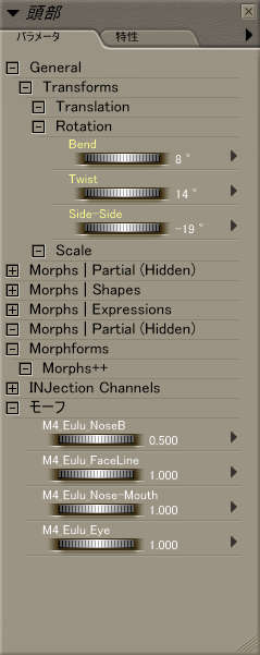 で、普通モーフキャラはそれひとつで顔全体が変わるのが多いですが、目・顎・鼻と口・鼻追加分、と分けます。