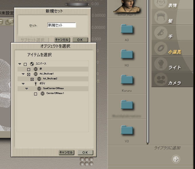 でも名前を付けるその前に、サブセット選択ボタンをクリックして、一緒に保存する物を選びます。別々のプロップになっちゃったA4_Skullcap1とA4_Skullcap2にチェックを入れて[OK]、新規セットの名前は、A4_Skullcapにしました。