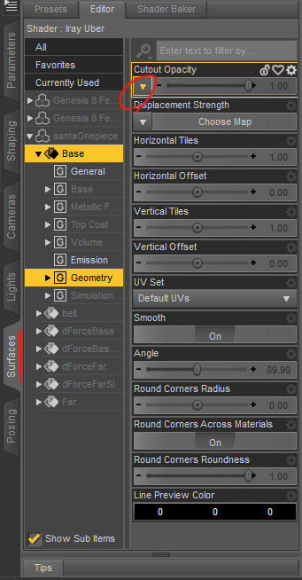 3.今回変更したいのは、サンタワンピに「Base」という名前で設定されている部分なので、そこ(Base)を選んで、Cutout Opacityのスライダーを探します。(見つからねーというときは、上の虫眼鏡マークのとこに「Opacity」とでも入力して検索というかフィルターかけましょう。)