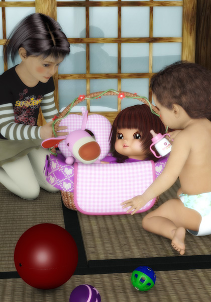 Kids4左が着てるのは、3DUniverseのKaitey for Kids 4(DAZ/有料)、髪の毛は赤まむしさんのnene hairです。