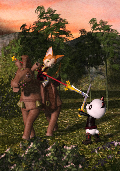 あと中華風だなーと思ったので、真仁堂さんが配布していた着ぐるみさん(http://ameblo.jp/majin-majin9991/entry-11907893849.html)(服ではなく、単独のフィギュアになってます)も貰ってきて、頭だけ小道具化して使いました。パンダ。