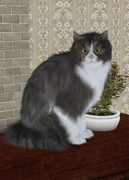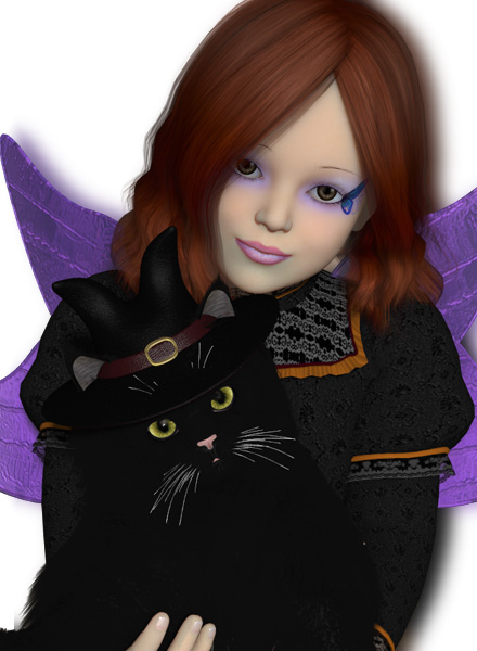 服はFrilly Dress(Treasure Chest)です。髪はPoser2012付属のアリソン髪。羽はpraeさんが配布していた物(たぶん、これに入ってる羽だと思う/有料)。ネコが被ってる帽子はEllequeさんのBlack Cat for V4の帽子です。