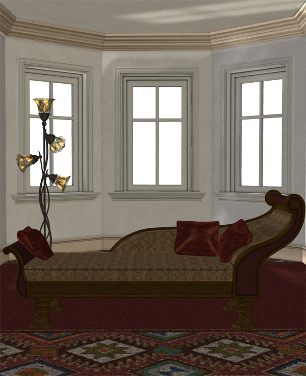 DAZのDream Homeシリーズの、Great Room(有料物)に、First Class Stateroom(有料物)に入ってる椅子(?)とDream Home : The Study Furniture(有料物)に入ってるランプとカーペットを置いてレンダリングした物。