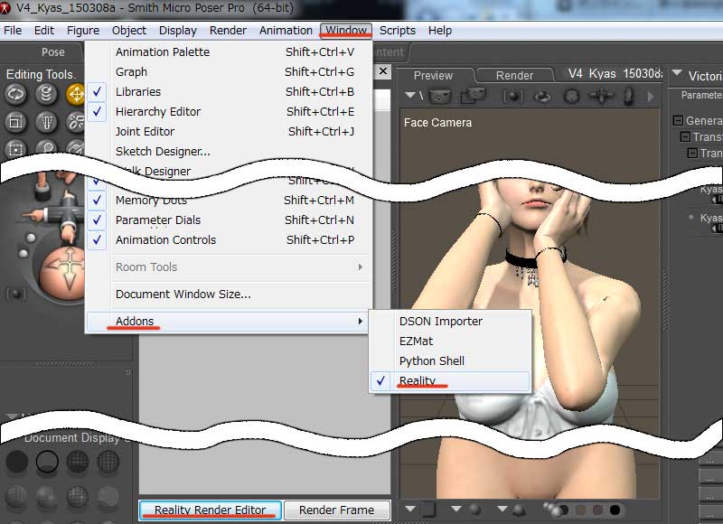 インストールしてPoser起動したらどこから起動するのか、というと、Window→Addons→Realityからです。